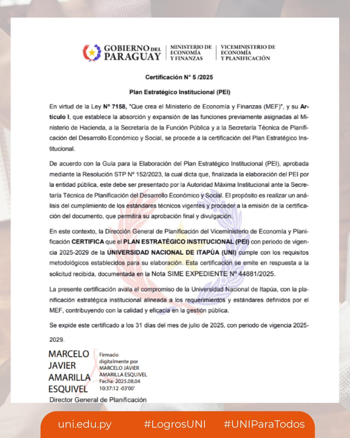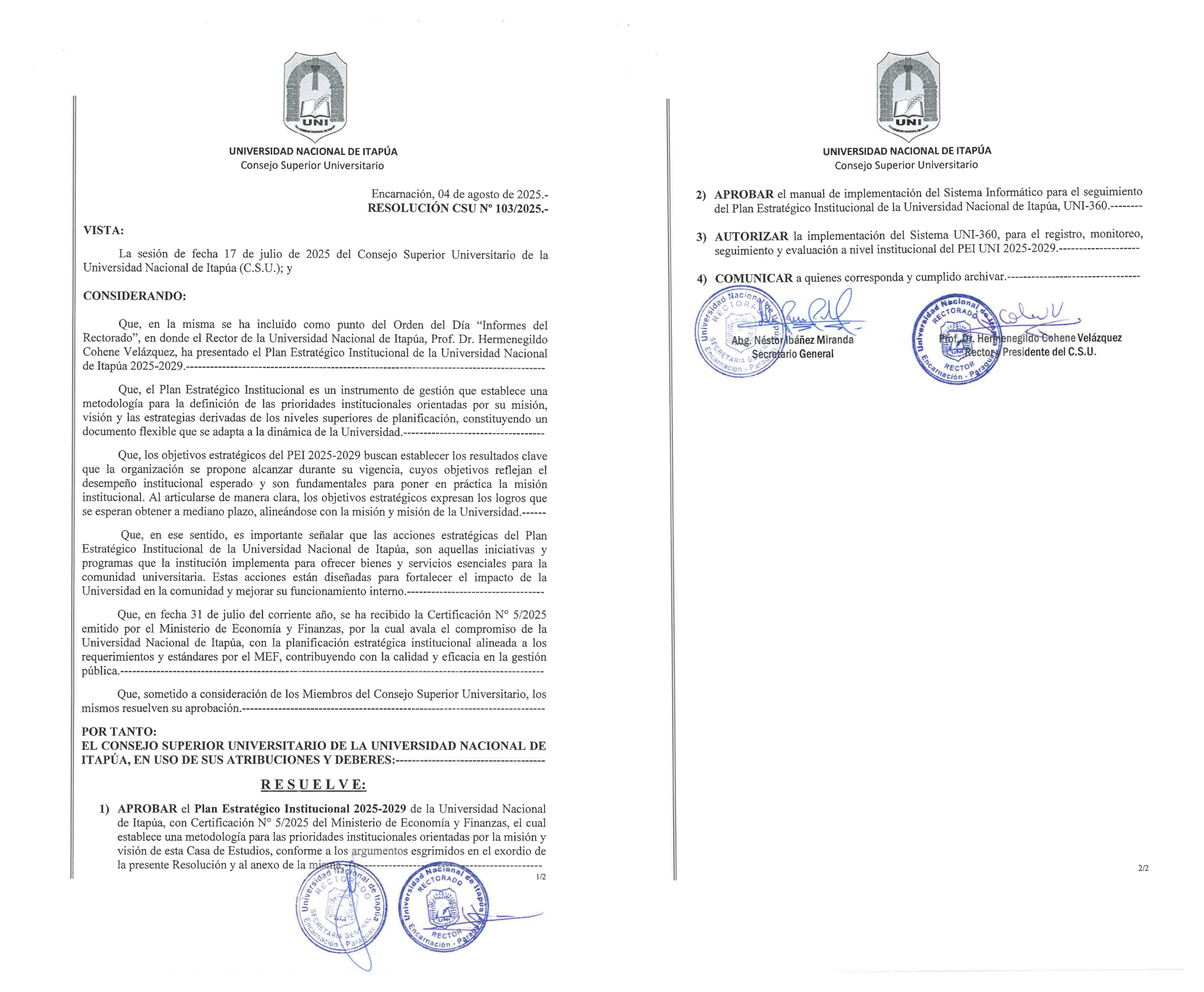 Sobre la base de estas experiencias institucionales, con el acompañamiento y directrices de la Guía para el Plan Estratégico Institucional (2023), propuesto por el Ministerio de Economía y Finanzas, en el 2024 la gestión institucional extendió la duración del PEI por un año. El Plan Estratégico Institucional 2025-2029 de la Universidad Nacional de Itapúa se enfoca en impulsar la excelencia académica y fomentar un desarrollo curricular innovador en todas las ofertas educativas. Además, este plan promueve la investigación y el desarrollo tecnológico, así como la transferencia de los resultados de investigación para impactar positivamente en la sociedad. Se prioriza el fortalecimiento de la vinculación social y el desarrollo sostenible mediante la extensión universitaria. Asimismo, se establece la innovación en la gestión universitaria y el desarrollo organizacional como pilares fundamentales para alcanzar los objetivos institucionales y contribuir al progreso de la comunidad a la que brinda su servicio educativo. Hermenegildo Cohene Velázquez |